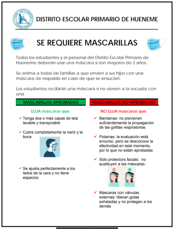 Se le REQUIERE a todo los estudiantes y al personal escolar del Distrito Escolar Primario de Hueneme a usar máscarilla.