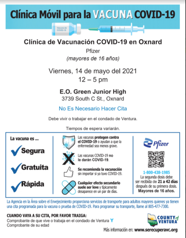 Nuestro distrito se ha asociado con del Departamento de Salud Pública del Condado de Ventura para traer una Clínica Móvil de Vacunación COVID-19 a nuestro distrito. La clínica móvil se instalará en la Secundaria de E.O. Green JHS ESTE VIERNES, el 14 de mayo de 12:00-5:00 p.m.