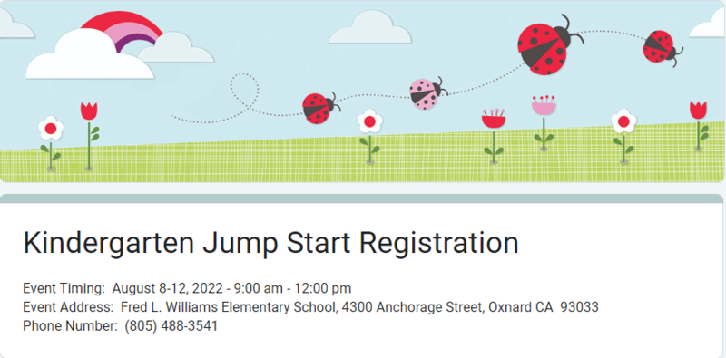 The Jump Start Program will take place at Williams Elementary School August 8-12 from 9:00 am-12:00 pm. If interested, please call our office to complete the Google form or click on the link that was sent to your family via text. Students with completed forms will automatically be enrolled. You will receive additional information about your child's enrollment in the program during the first week of August. If you have questions, please call (805) 488-3541.
